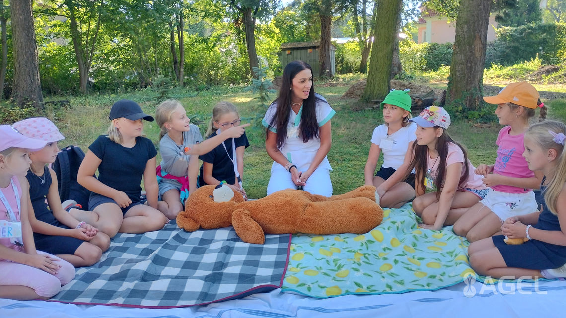 Seznamovací hry, úkoly k tématu malý záchranář, kurz resuscitace pro děti (na figuríně) a procvičení celkové první pomoci, ukázka použití AED, odpoledne venkovní aktivity (bojovka)